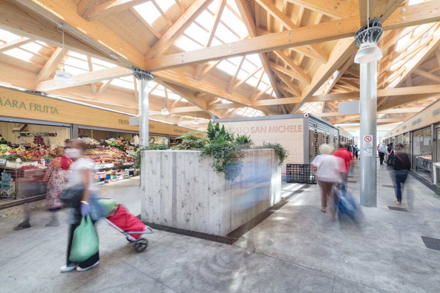 Il risultato è uno spazio ampio e arioso, dove i percorsi pedonali e le botteghe dialogano in modo fluido, valorizzando la vita quotidiana del mercato.