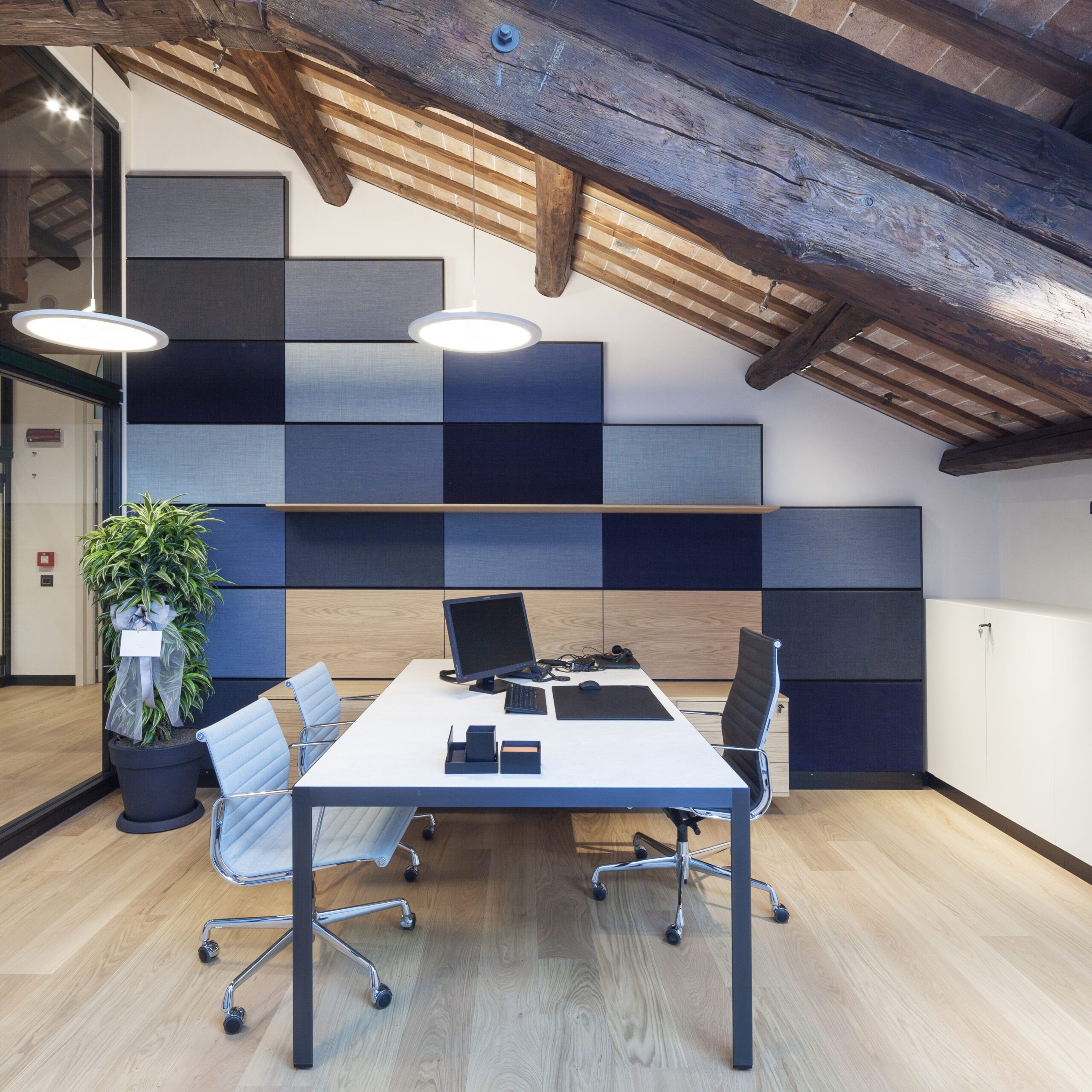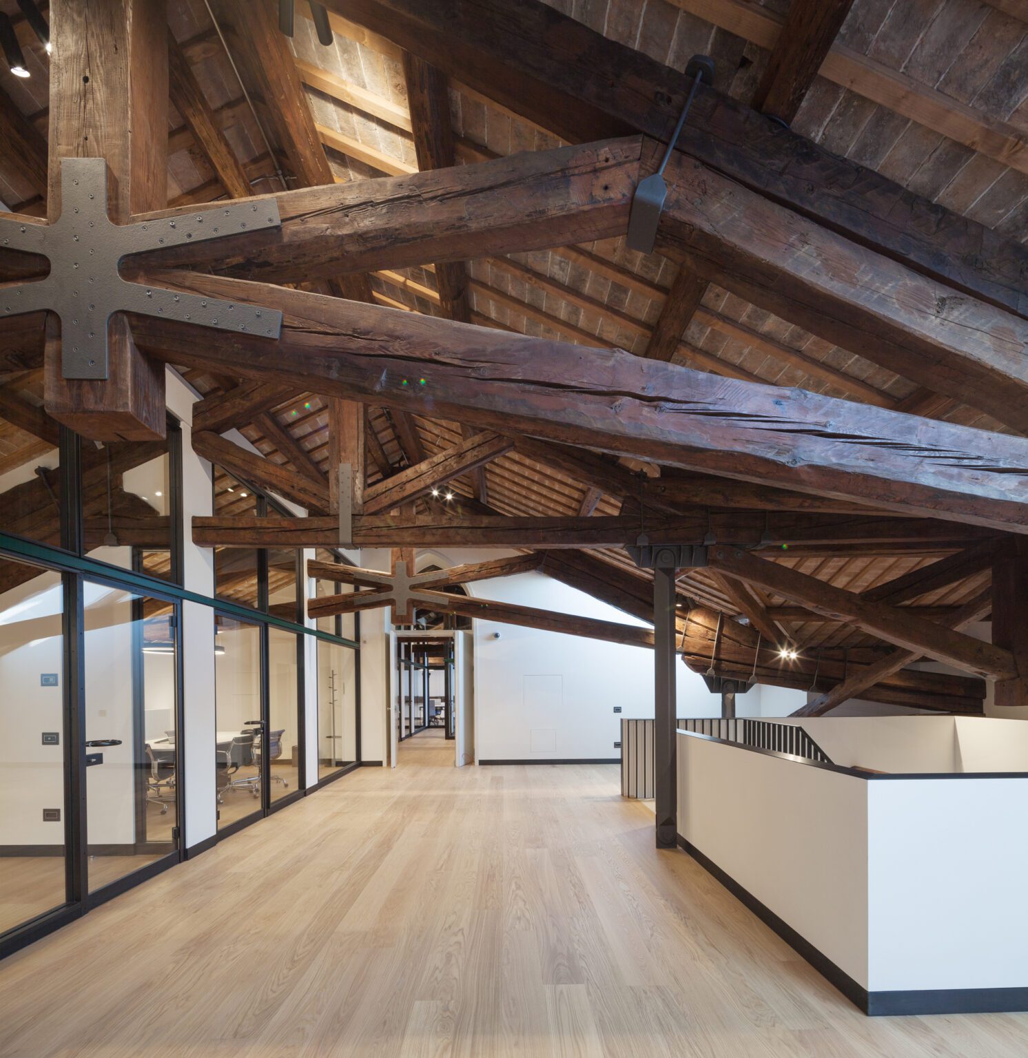 Il restauro conserva le superfici originarie, gli apparati decorativi e gli elementi lapidei, integrandoli con interventi puntuali di consolidamento strutturale. Le capriate lignee, le murature storiche e le volte vengono restaurate e messe in sicurezza, mentre gli impianti sono completamente rinnovati e integrati con discrezione, attraverso cavedi tecnici e soluzioni che non interferiscono con le geometrie esistenti. L’insieme degli ambienti è organizzato come una sequenza di spazi luminosi e modulari, adatti al lavoro, alla rappresentanza e alla fruizione culturale.
