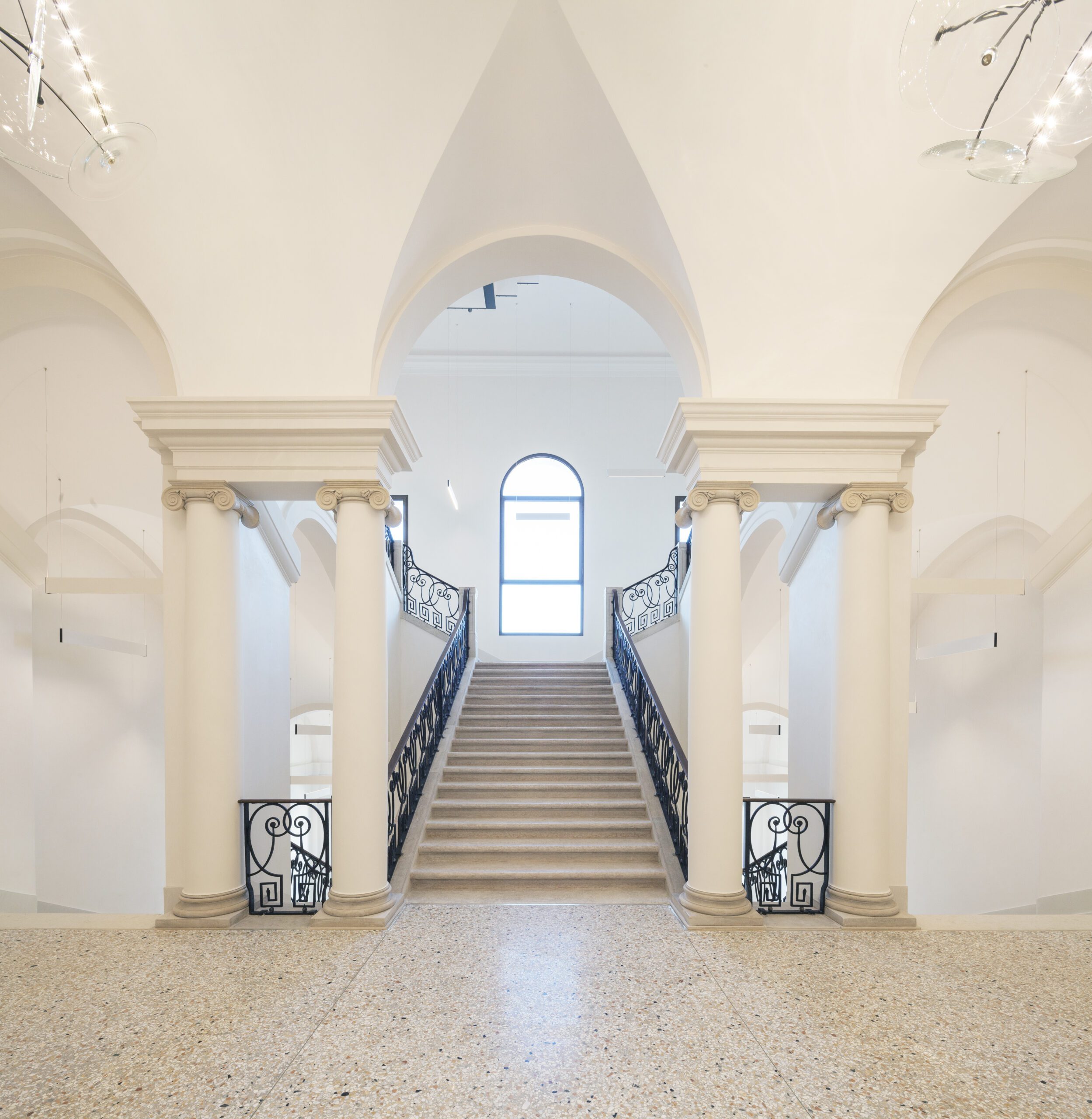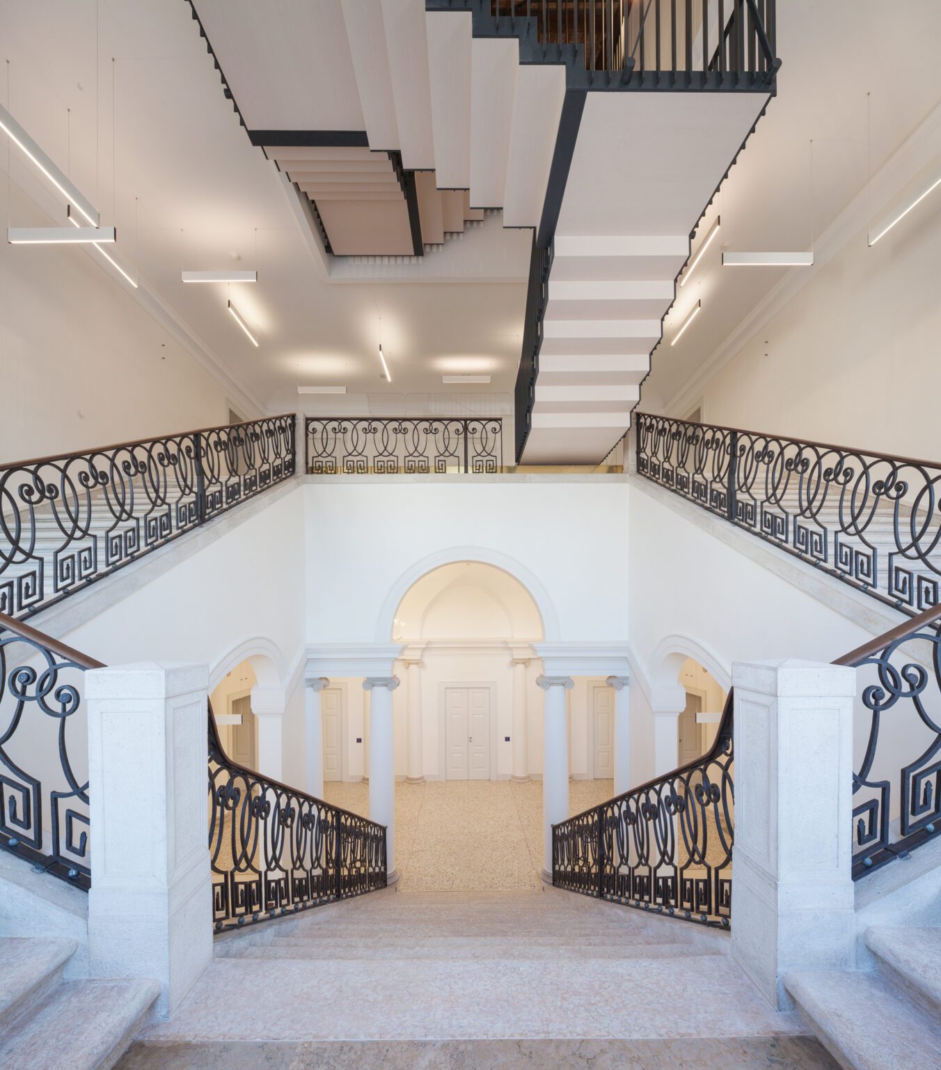 La visione alla base dell’intervento è quella di riordinare un sistema edilizio complesso senza cancellarne la storia. La struttura originaria – fatta di corti, logge, saloni di rappresentanza e percorsi distributivi regolari – viene riportata alla sua leggibilità grazie alla rimozione degli elementi incongrui e alla ricomposizione dei rapporti tra pieni e vuoti. Gli spazi interni, un tempo frammentati, vengono organizzati per accogliere uffici direzionali e aree espositive, reinterpretando la logica modulare delle aperture storiche per garantire flessibilità d’uso .