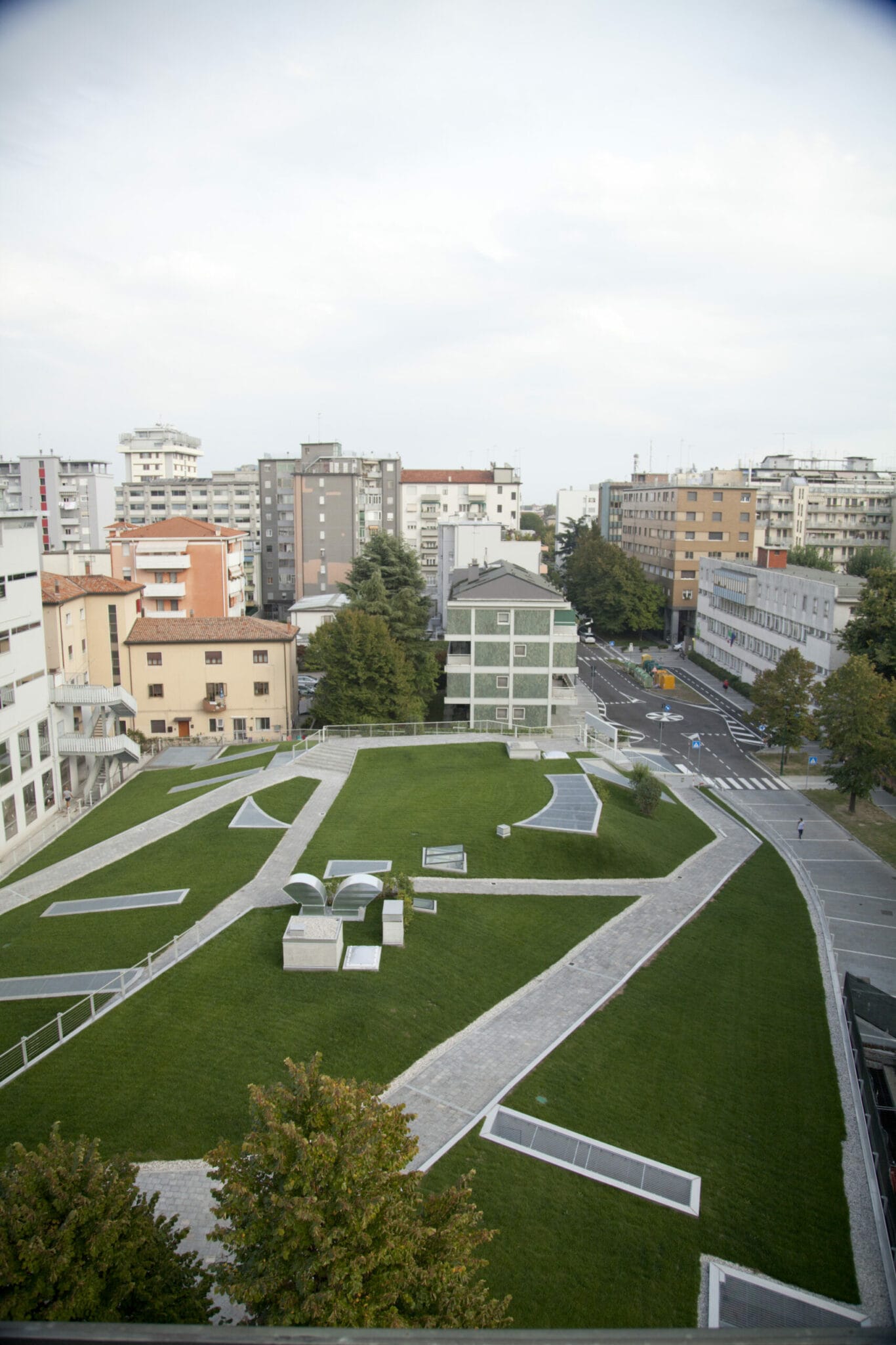 La nuova struttura interrata distribuisce 350 nuovi posti auto su quattro piani migliorando sensibilmente la dotazione di spazi per il parcheggio in una zona strategica della città, al di sotto di una copertura verde inclinata che costituisce la prosecuzione ideale del parco della villa sull’altro lato di via Costa.